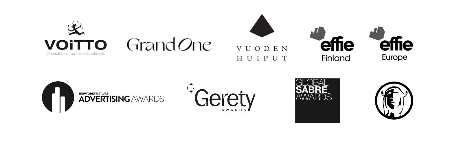 simelius simelius has awarted and shortlisted globally in Effie Europe, Gerety Awards, New York Advertising Awards and Global Sabre Awards, and also in the most notable advertising awards in Finland: Voitto – Commercial Film Awards, Vuoden Huiput and Grand One. simelius simelius has won the Emma Award two times for the best music video of the year.